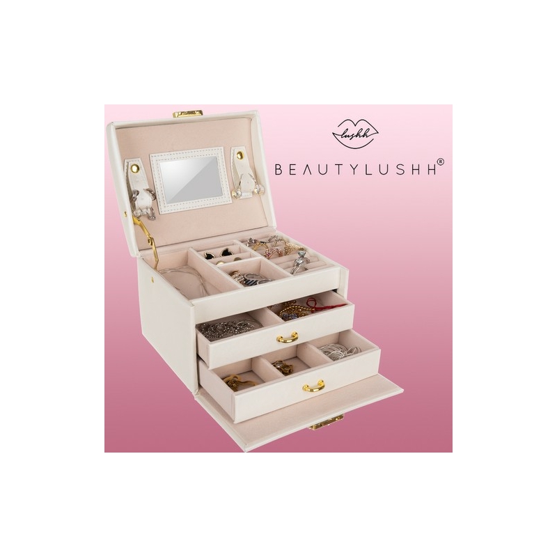 A kisebb tárgyakat, például medálokat, fülbevalókat és gyűrűket tökéletesen kiszolgálják a speciálisan kialakított, tekercs alakú rekeszek, amelyek stabilan tartják az apró értéktárgyakat. A tükör mellett elhelyezett, pattintható pántok lehetővé teszik a karkötők, láncok stb. tárolását, védve azokat az elvesztés ellen. A pántokhoz több sminkkefét vagy fülbevalót is rögzíthet a speciális lyukaknak köszönhetően.