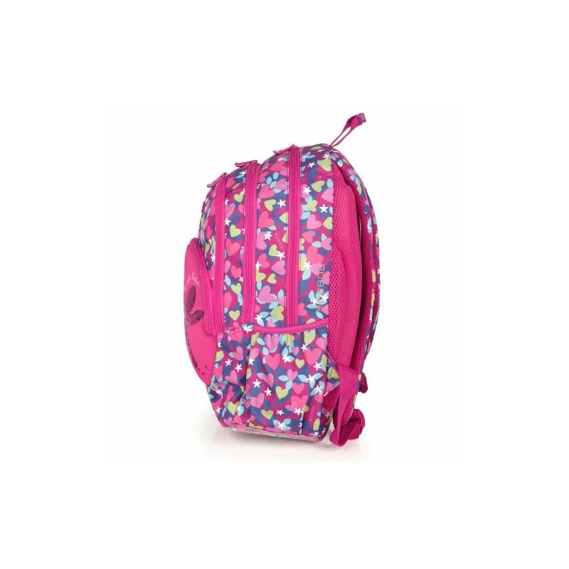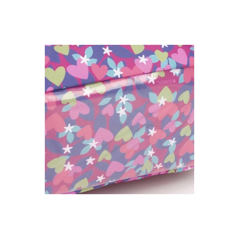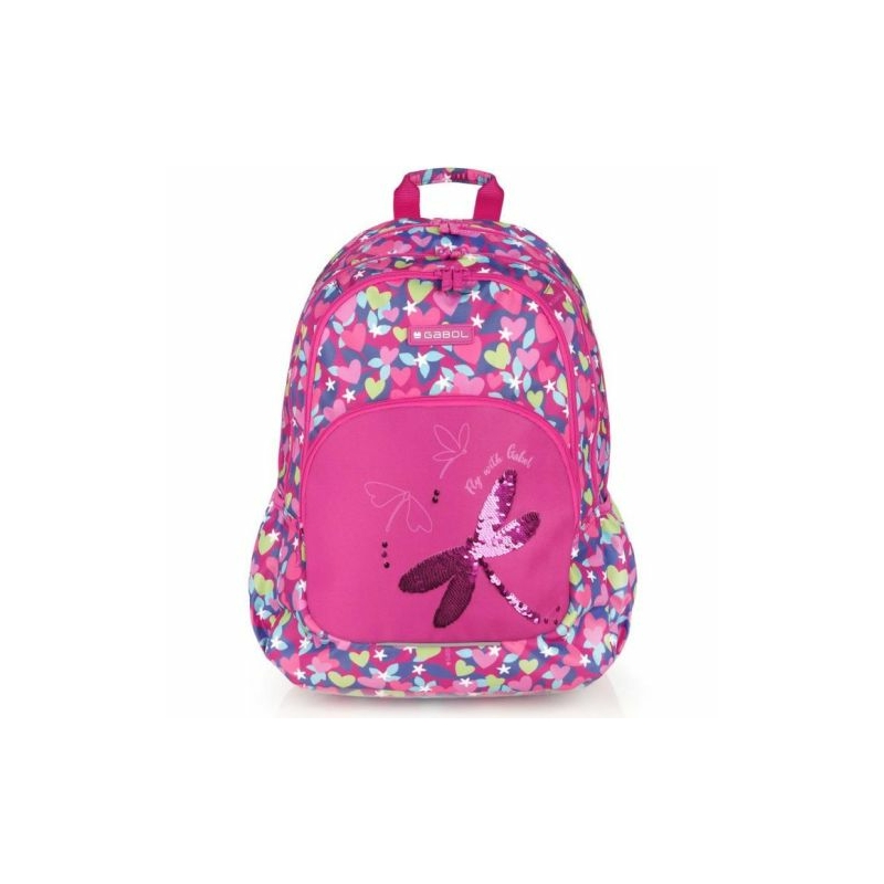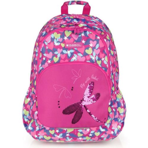 Gabol Wings hátizsák. Kézben, és állítható, szivacsos vállpántjainak, valamint szintén szivacsos (ergonomikus) hátrészének köszönhetően háton egyaránt kényelmesen hordható. A hátizsák két fő-, két elülső mellék-, és két oldalsó rekesszel rendelkezik. Nagyobbik főrekeszében találjuk a névcímkét és egy mappák tárolására alkalmas zsebet, másik főrekeszében pedig egy kisebb zseb kapott helyet. A két elülső mellékrekesz remek hely egyéb iskolai dolgaink, valamint személyes tárgyaink tárolására. Két oldalsó rekesze, a gumírozott zsebeknek köszönhetően lehetőséget kínálnak egy-egy kisebb palack tárolására.