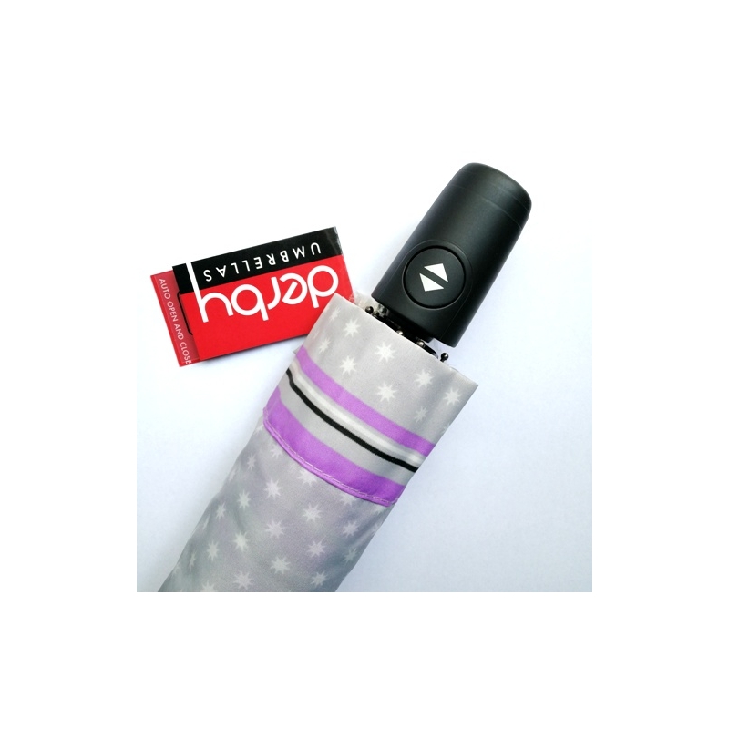 Derby Hit Magic Starlet automata női esernyő. Az esernyő könnyű kezelhetőségét az oda-vissza automatika biztosítja. Mintázata és színei gyorsan meghódították a hölgyek szívét. A gyártó 2 év garanciát biztosít a Derby esernyőkre.