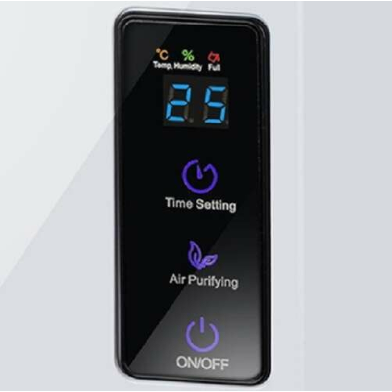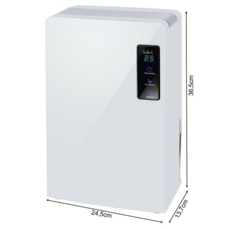 MŰSZAKI ADATOK - színe: fehér; anyag: Anyag: ABS + alumínium + AS + PVC; kijelző: LCD, mutatja: hőmérséklet és páratartalom; időzítő: 24 - órás; 2in1 légtisztítás és párátlanítás; 0 alatti hőmérsékleten való munkavégzés képessége: igen -5oC; automatikus leolvasztási funkció; helyiség mérete: legfeljebb 30m2; tisztítás: UV fényt és titán-dioxid ( TiO2 ) tisztítási technológiát használ a légszennyező anyagok lebontására; zajszint: 40 dB; párátlanítási hatékonyság: akár 700 ml naponta 25oC és 85% páratartalom mellett; víztartály kapacitása: 1800ml; víz leeresztésének lehetősége tömlőn keresztül: igen; feszültség: 220-240V; teljesítmény: 90W; automatikus kikapcsolás a tartály megtelte után: igen; működési mód: Peltier-rendszeren alapul; alkalmas: otthon, irodában, stb. ; kivehető víztartály; méretek: 1 db: 36,5/13,7/24,5cm; tömlő hossza: 100cm; kábel hossza: 1,30m; súly: 2,382kg; súly csomagolásban: 2,781kg.