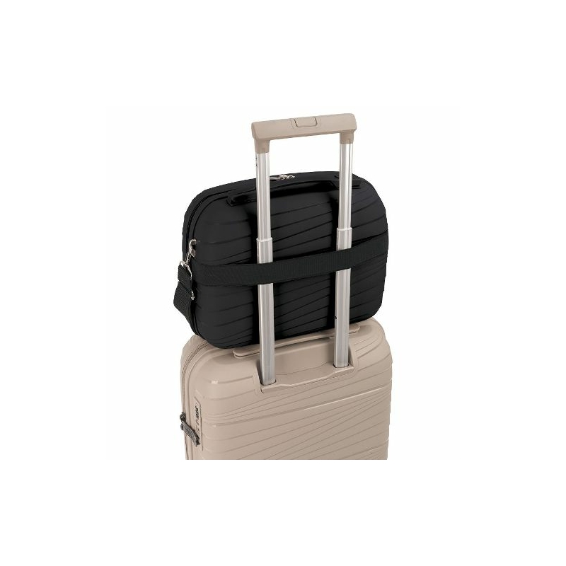 A Gabol Kiba fekete színű keményfedeles, cipzáras piperetáska rugalmas polipropilén anyagból készült. A kozmetikai táska különféle kozmetikumok, pipereholmik elhelyezésére ad lehetőséget. Belsejét hálós és cipzáras extra zsebek gazdagítják, valamint gumis rögzítő pántok segítik a pakolást, rendezést. A táska belseje cipzáras megoldással két részre osztható. A beauty táska bőröndök húzószerkezetére ráhúzható a hátulján található gumis pánt segítségével.Etáska - minőségi táska webáruház hatalmas választékkal