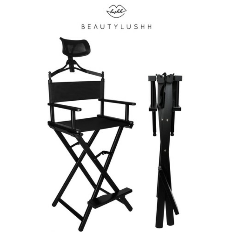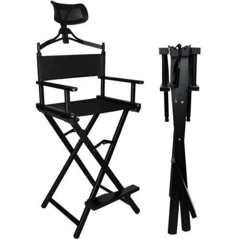 Összecsukható sminkszék fejtámlával - Rendkívül erős és kényelmes székünk a sminkeléshez, fodrászathoz, rendezői székként is kiválóan működik. Fekete alumíniumból készült. Az ülés vízálló Oxford 600D anyagból készült. Ezen kívül a széket kényelmes fejtámlával láttuk el, ami tovább növeli a kényelmet a hosszú munkamenetek során. A termék 140 kg-os teherbírással rendelkezik ! Az alján lévő lábak stabilan tartják és garantálják a biztonságot a használat során.