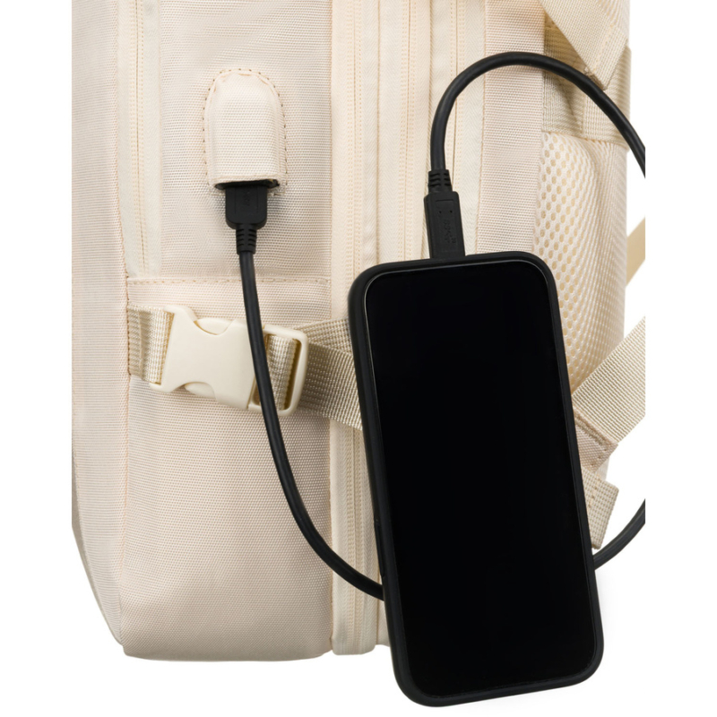 A hátizsák oldalán található egy USB-port , amelyet gondosan integráltak a dizájnba, feltűnő jelölések nélkül. Belül található egy kábel egy külső akkumulátor csatlakoztatásához, amely lehetővé teszi telefonja vagy más eszköze töltését a hátizsák kinyitása nélkül.