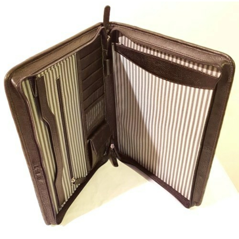 A Rosme Tumble bőr irattartó mappa első osztályú anyaga és kimunkálása méltán megállja helyét a bőrdíszműves iparágban. Igényes, letisztult forma. Egy cipzáras főrészből áll, melyet egy sima- és egy cipzáras nagyobb mellékzseb gazdagít. Emellett tartalmaz még egy irattartó fület, rendelkezik névjegytartókkal és két kisebb zsebbel. A mappa A4-es méretű iratok tárolására alkalmas. Anyaga finom tapintású, valódi, minőségi bőr.