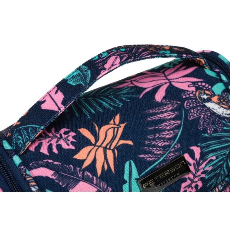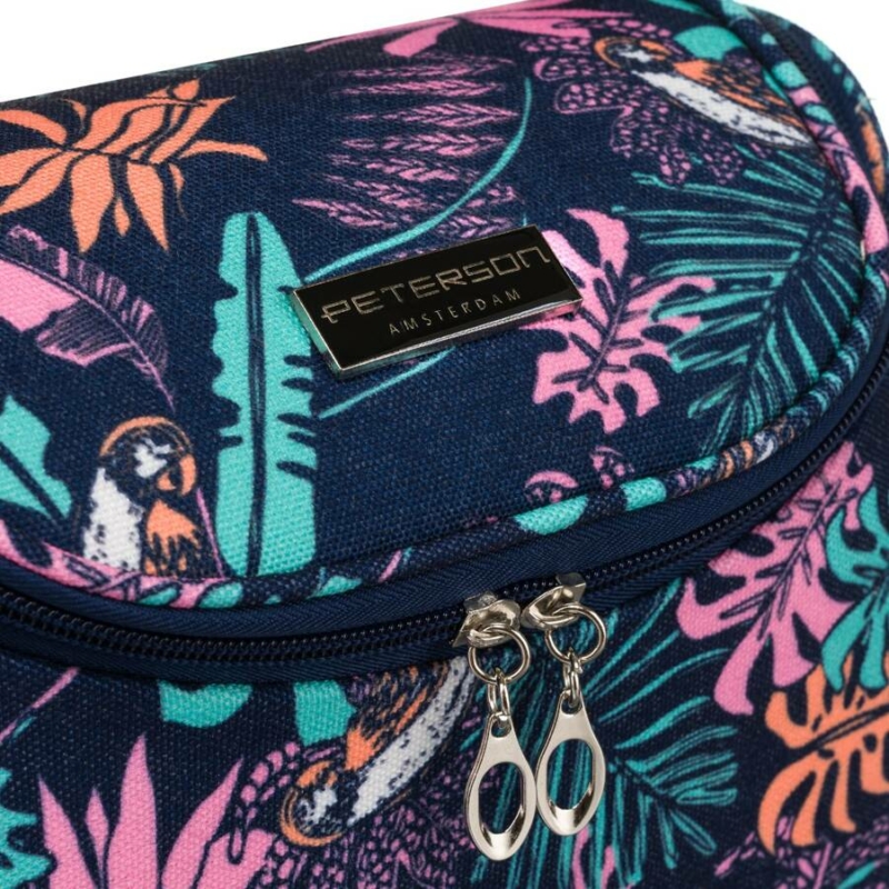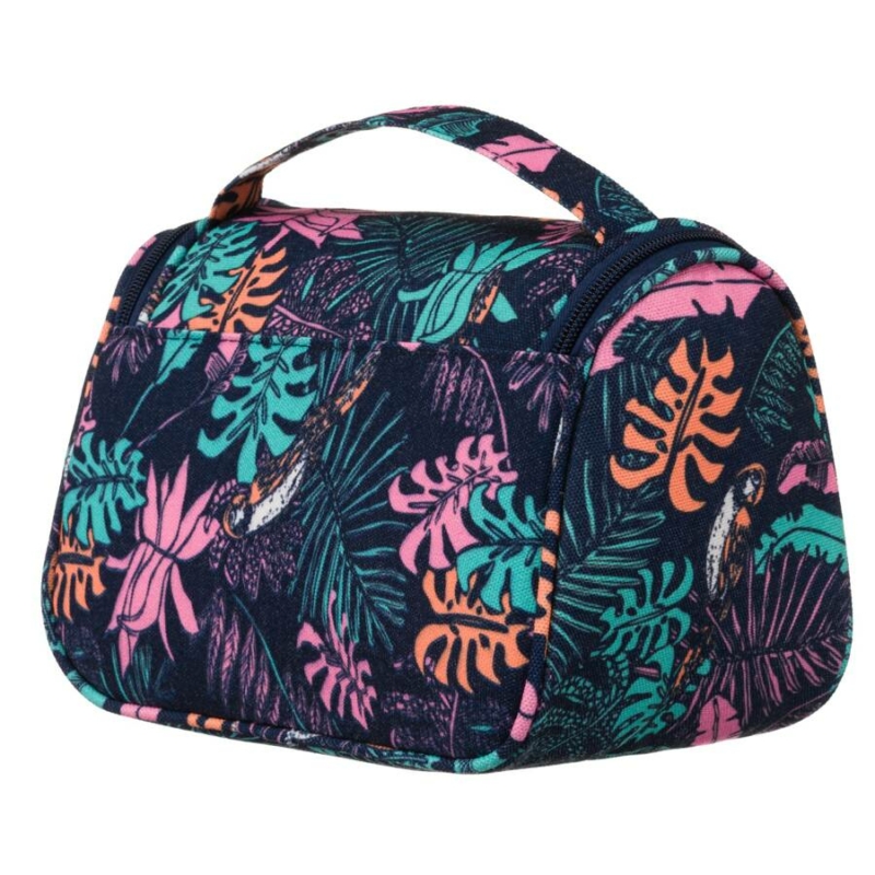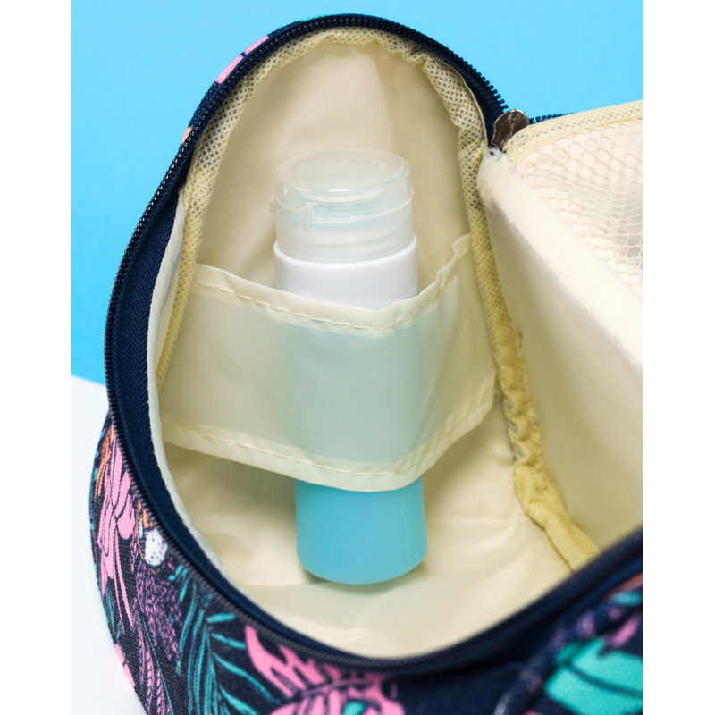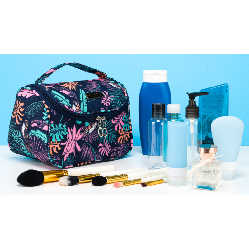 Trópusi dizájnú kozmetikai táska . Külső része sötétkék, növényi motívummal díszített anyagból készült . A sötét hátteret a különböző formájú levelek uralják, kontrasztos színekben, például rózsaszín, türkiz és lila.