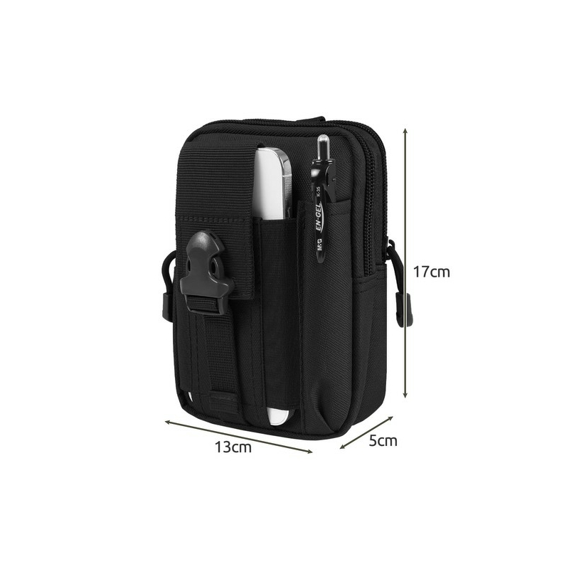MŰSZAKI ADATOK - szín: fekete; anyag: fekete: Anyag: 600D oxford szövet, nejlon, PP, TPE, poliészter, cinkötvözet; övrögzítés: pántok; rekeszek száma: Zsebek száma: 2; zsebek száma: 2 db: 4; telefonzseb: Igen; tolltartó zseb: Tolltartó: IGEN; méretek: 13 x 5 x 17 cm; szíj hossza: 117 cm; készlet súlya: 0,33 kg készlet súlya a csomagban: 0,35 kg.
