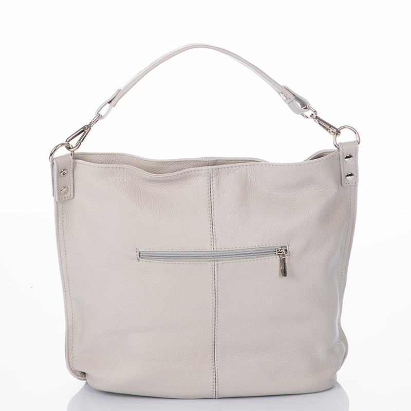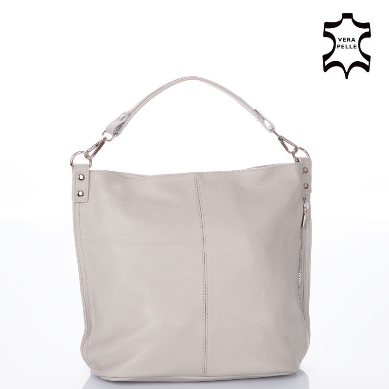 Valódi bőrből készült, fekete színű, pakolós női táska, ami mindenhez illik. Belseje osztott, bélése világos, bézs színű. Középen egy cipzáras rekesszel van elválasztva a pakolótér. Oldalsó zsebek is találhatóak még benne, egy cipzáras és egy mobiltartó. Külső cipzáras zsebekkel is felszerelt, méghozzá kettővel is. Kétféleképpen viselhetjük, rövid pánttal, amelynek hossza 48 cm, de ezt le is csatolhatjuk róla, ha kényelmesebbnek gondoljuk a hosszú pántot, ennek hosszúsága szabályozható, maximum 120 cm-ig. A táska teteje cipzáras, biztonságos.